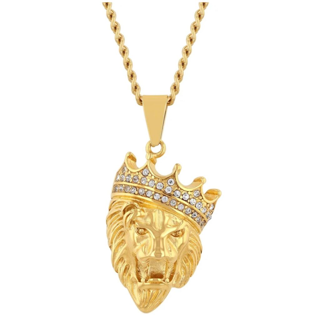 Believe by Brilliance Men’s Gold-Tone Stainless Steel Crystal Crown Lion’s Head Pendant 24″ Necklace