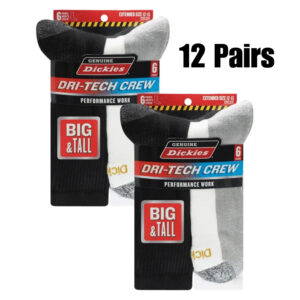 Dickies Men’s Dri-Tech Crew Socks, 12 pack- Black/White Ext size 12-15
