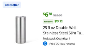 $6.78 Double Wall Stainless Steel Slim Tumbler, Slider lid, 25 fl oz