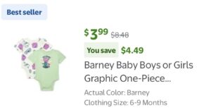 $3.99 Barney Baby Boys or Girls Graphic One-Piece Bodysuits, 2-Pack, Sizes 0/3M-24M