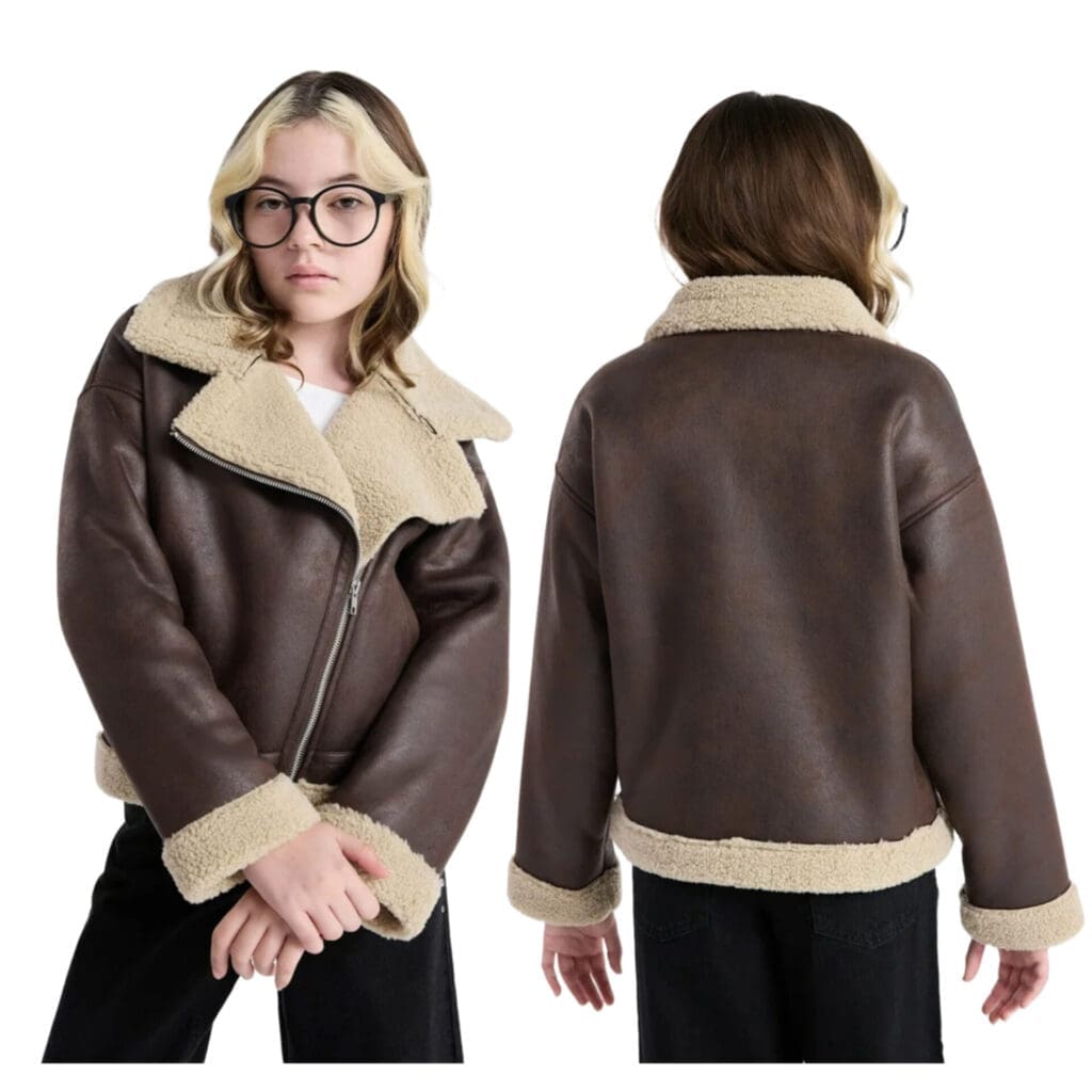 Girls Faux Leather Biker Jacket with Faux Shearling Trim, Sizes 4-18