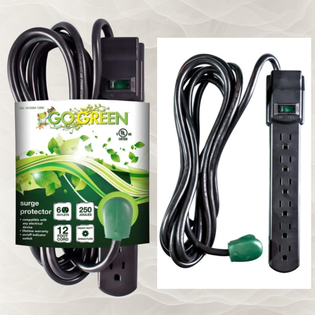 GoGreen Power 6 Outlet Surge Protector, 12ft Cord, 15 AMP circuit breaker, Right Angle Plug
