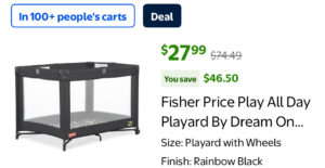 This playard is so practical. It’s from Dream On Me, but it has that classic Fisher-Price feel — super reliable. The Rainbow Black design is really cute too: the black frame is sleek, but the interior pad has a fun colorful print, so it’s not just plain.
